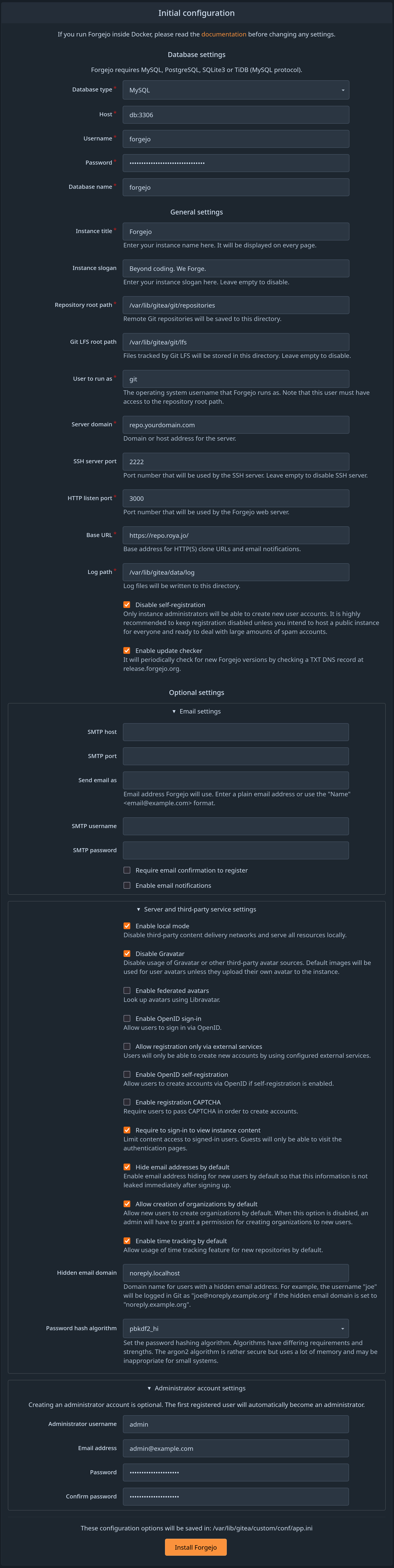 Configure Forgejo to your liking, keep “SSH server port” set to 2222, and click “Install Forgejo”.